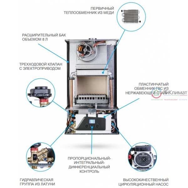Котел включает качественные комплектующие с повышенными эксплуатационными характеристиками для длительной и безотказной работы оборудования. Латунная гидравлическая группа, медный первичный теплообменик, теплообменник ГВС из нержавеющей стали. Пластинчатый теплообменник из нержавеющей стали и клапан с электроприводом дают возможность получать стабильную температуру горячей сантехнической воды при использовании на кухне или в ванной комнате. Все технические компоненты на 100 % Made in Italy и/или Made in Europe.
